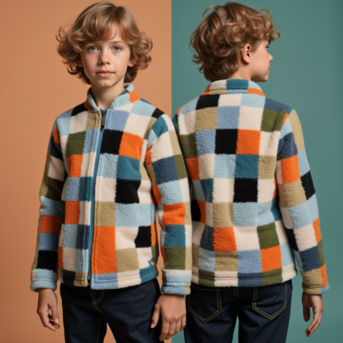 The jacket uses soft, plush fleece that delivers warmth and comfort with a gentle touch against the skin. Fleece fabric is known for its warmth-to-weight ratio, quick-dry properties, and easy care, making it well-suited for active kids who may encounter spills or light rain. The geometric block pattern is integrated into the outer surface, enhancing visual appeal without compromising fabric integrity. Sustainability considerations include durable construction designed for repeated washing and long wear life, helping retailers and families reduce replacement cycles. The fleece is chosen for its ability to maintain softness after multiple launderings, contributing to a lasting, brand-friendly garment that aligns with value-focused production goals.