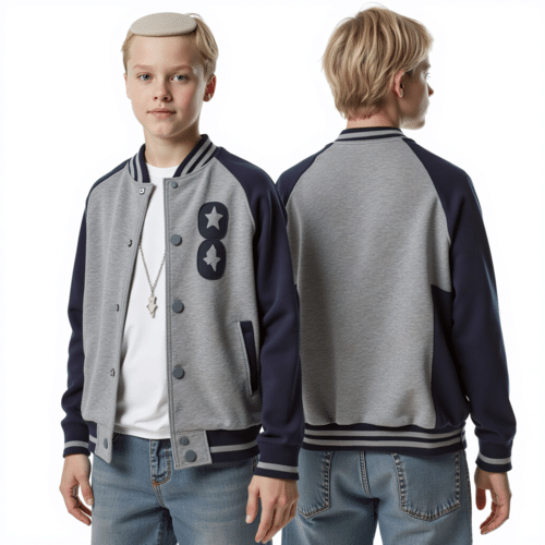 The jacket tells a story of modern youth style: a classic varsity silhouette reimagined for today’s active lifestyles. The light grey body and navy sleeves create a striking two-tone effect that stands out in crowded hallways and city streets alike. Built for comfort, the garment uses soft yet durable materials and reinforced stitching to withstand daily wear. The snap-front enclosure allows quick dressing, while the ribbed knit collar, cuffs, and hem keep warmth in and cold air out. The two-tone color blocking is more than a fashion statement; it makes pairing simple, from casual jeans to sporty joggers. A decorative patch on the left chest featuring an “8” and two stars adds a bold graphic element that resonates with youth culture. The back is clean and free of graphics, highlighting the sleeve contrast and the premium finish. The jacket is often styled with light blue jeans for a complete casual, street-ready look that’s comfortable for all-day wear. This piece is designed for youth who value both style and comfort, offering a versatile option for school, clubs, and social outings. The design supports self-expression without sacrificing durability or ease of care, making it a reliable wardrobe staple for active teens and preteens. The garment, paired with the right accessories, can become the foundation of a confident, fashion-forward look for everyday adventures.